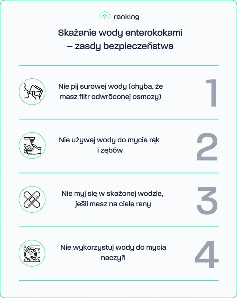 Dobra wiadomość jest taka, że takie sytuacje zdarzają się rzadko. Woda kranowa podlega regularnym badaniom, a w przypadku wykrycia obecności enterokoków lub innych bakterii, konsumenci są od razu informowani o zagrożeniu.