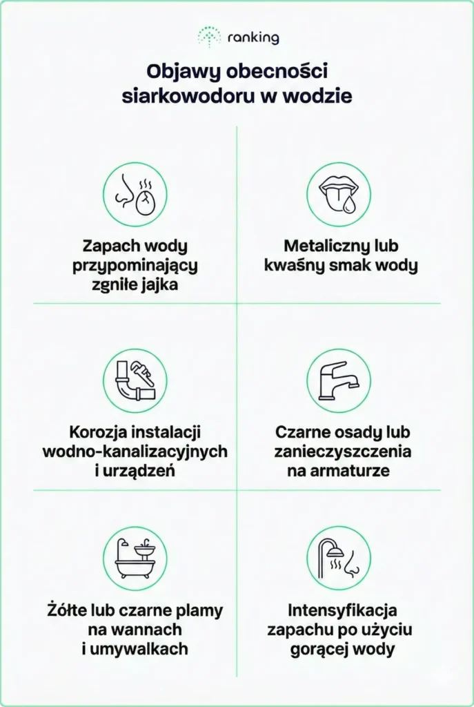 Oprócz charakterystycznego zapachu o obecności siarkowodoru w wodzie mogą świadczyć także:
