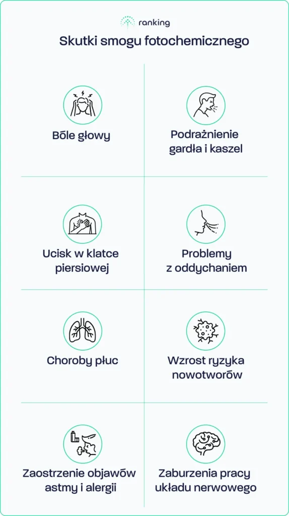 Sam ozon w dużych ilościach powoduje m.in. senność, bóle głowy i spadek ciśnienia krwi. Ekspozycja na smog fotochemiczny sprzyja także podrażnieniom układu oddechowego i oczu.